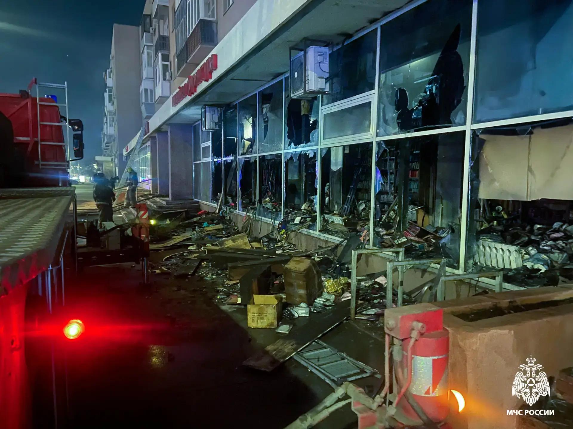 На фотографии с места пожара видны выбитые стеклянные витрины магазина.