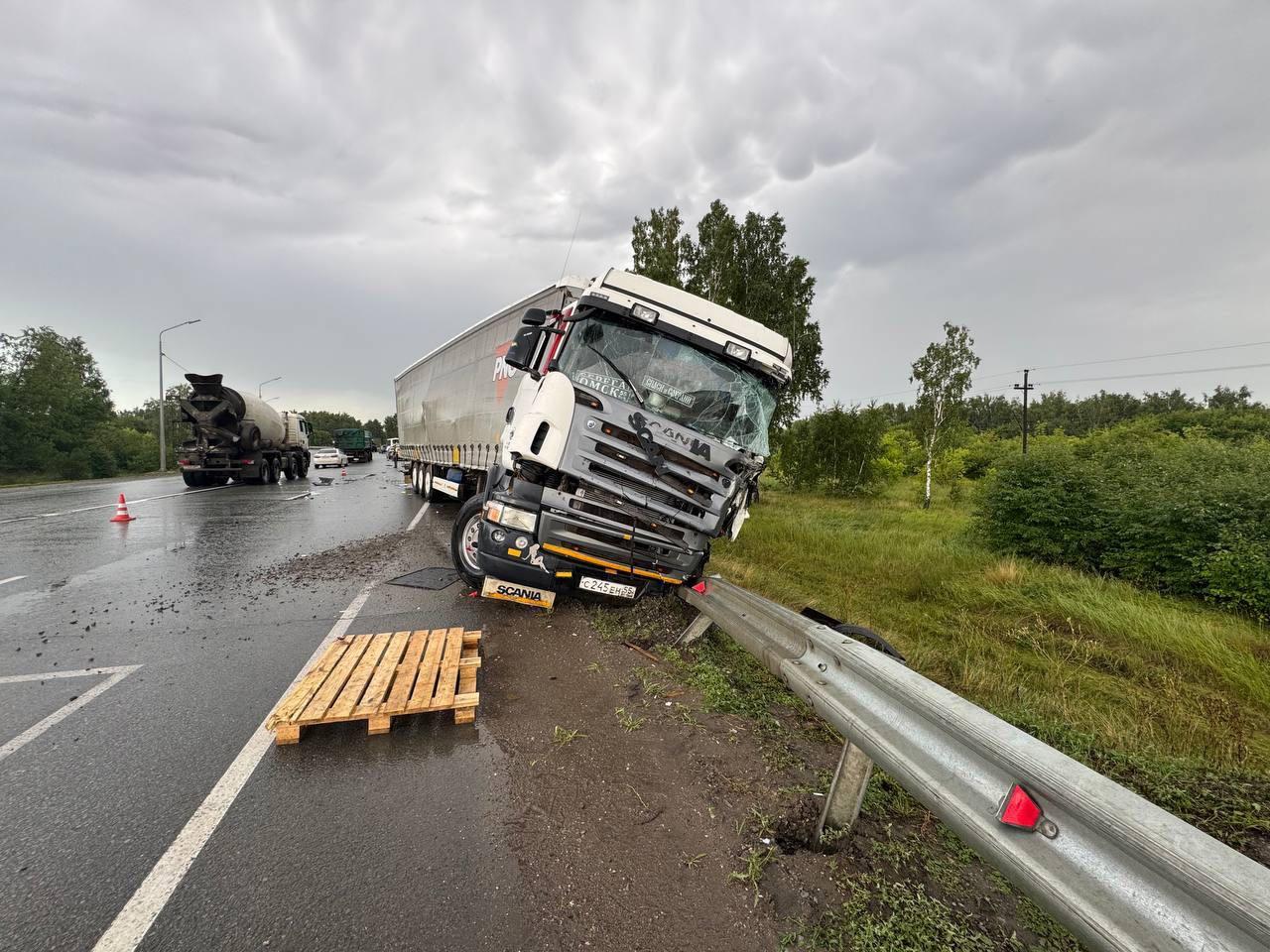 Серьезное дорожно-транспортное происшествие случилось в июле прошлого года на трассе Омск—Новосибирск. Водитель фуры Scania выехал на полосу встречного движения, врезался в пассажирский автобус ПАЗ и практически съехал в кювет.