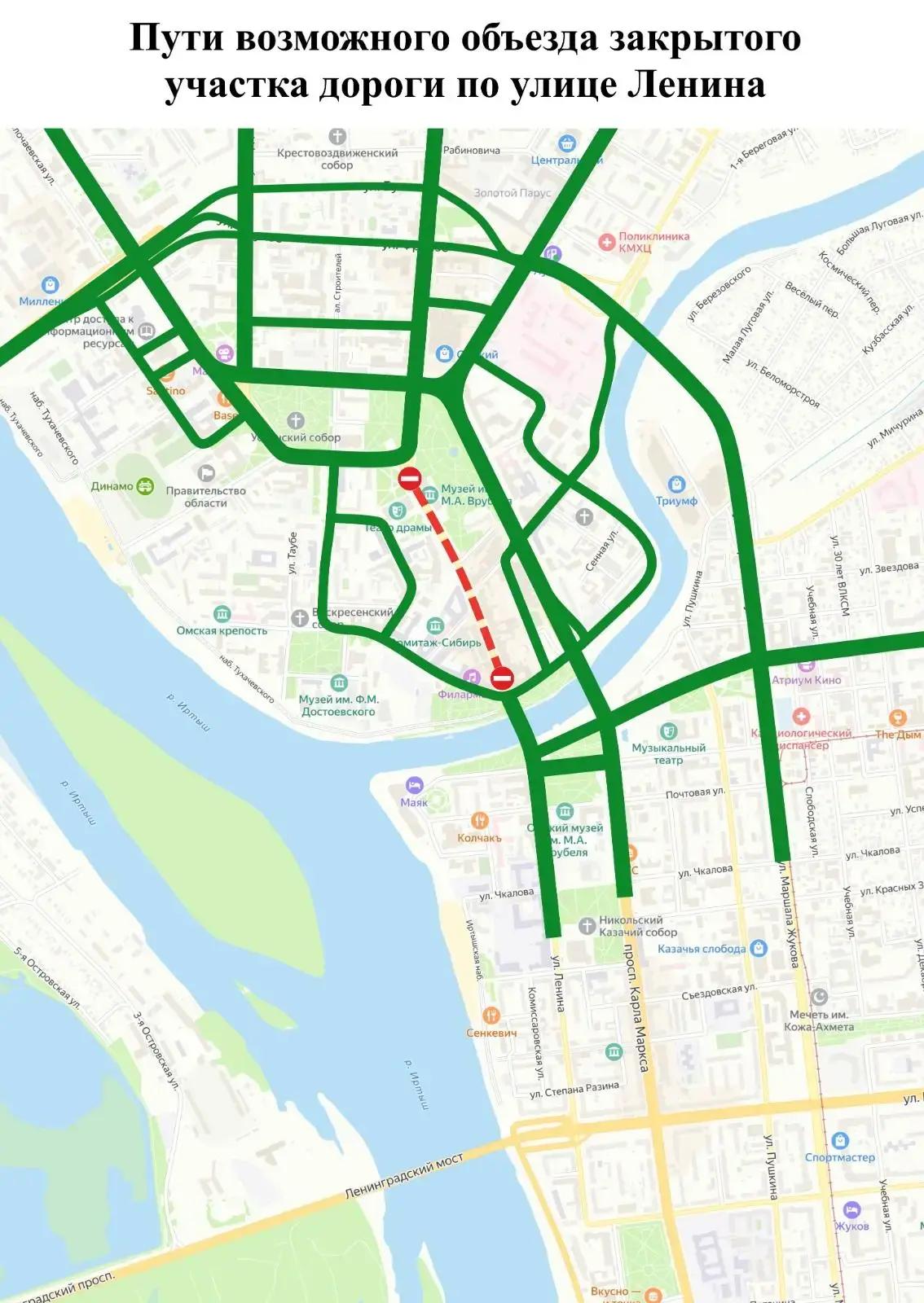 В мэрии города пояснили: «Автомобилистам предлагают объезжать перекрытый участок улицы Ленина по улицам Интернациональной, Гагарина, Тарской, Спартаковской, Партизанской, Бударина, Щербанева, площади Победы. Предупреждать омичей о действующих ограничениях будут информационные стенды».